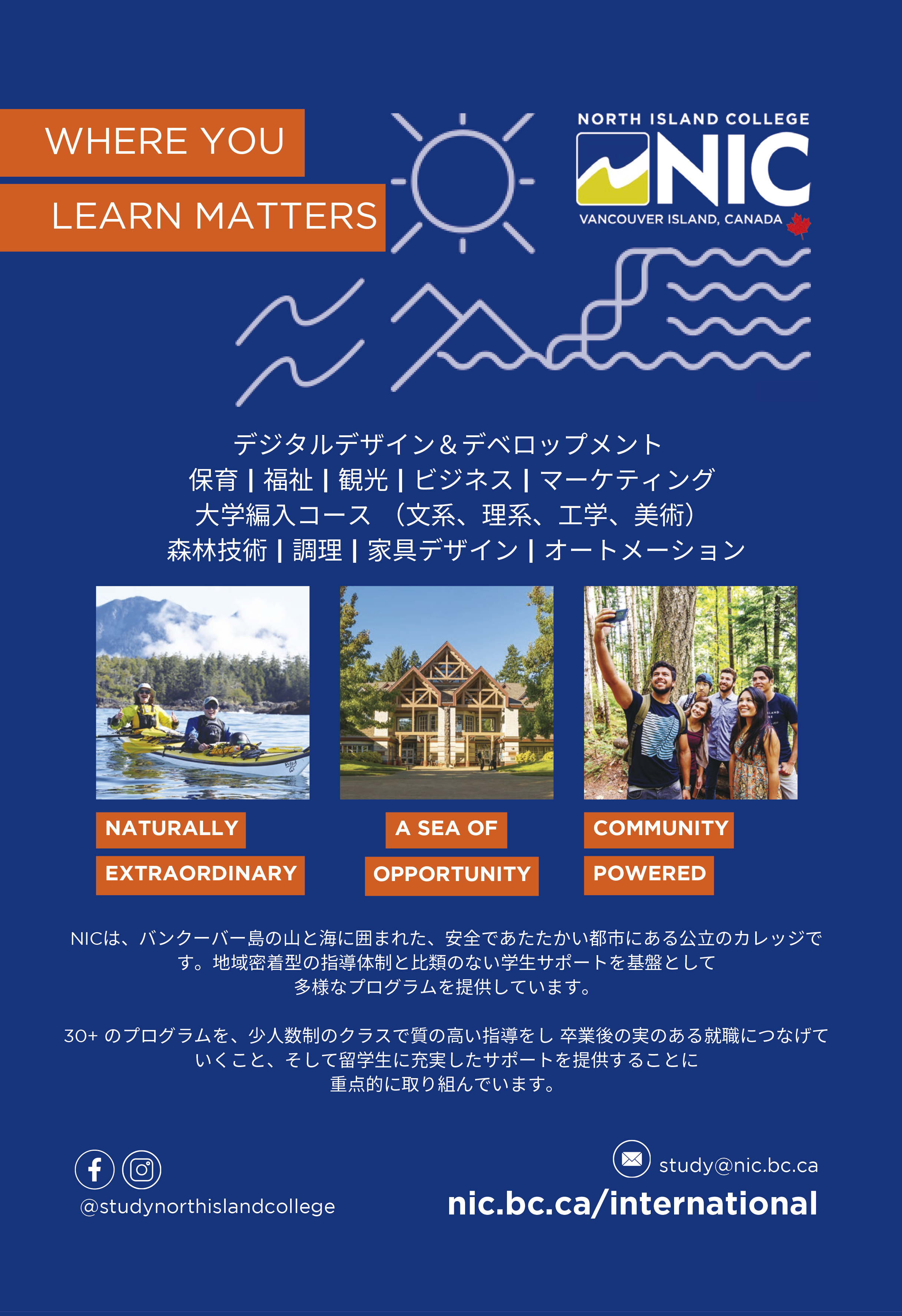 カナダ西海岸、ブリティッシュ・コロンビア州の美しいバンクーバー島に位置するNorth Island College(NIC)は、少人数制の公立カレッジです。